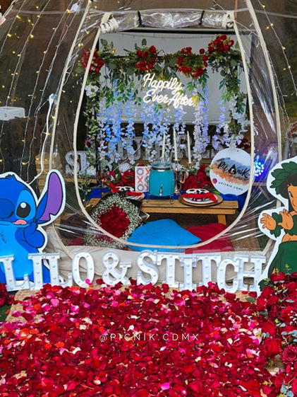 3–6 PM · Picnic romántico bajo corazón gigante de rosas, con frase personalizada y comida opcional